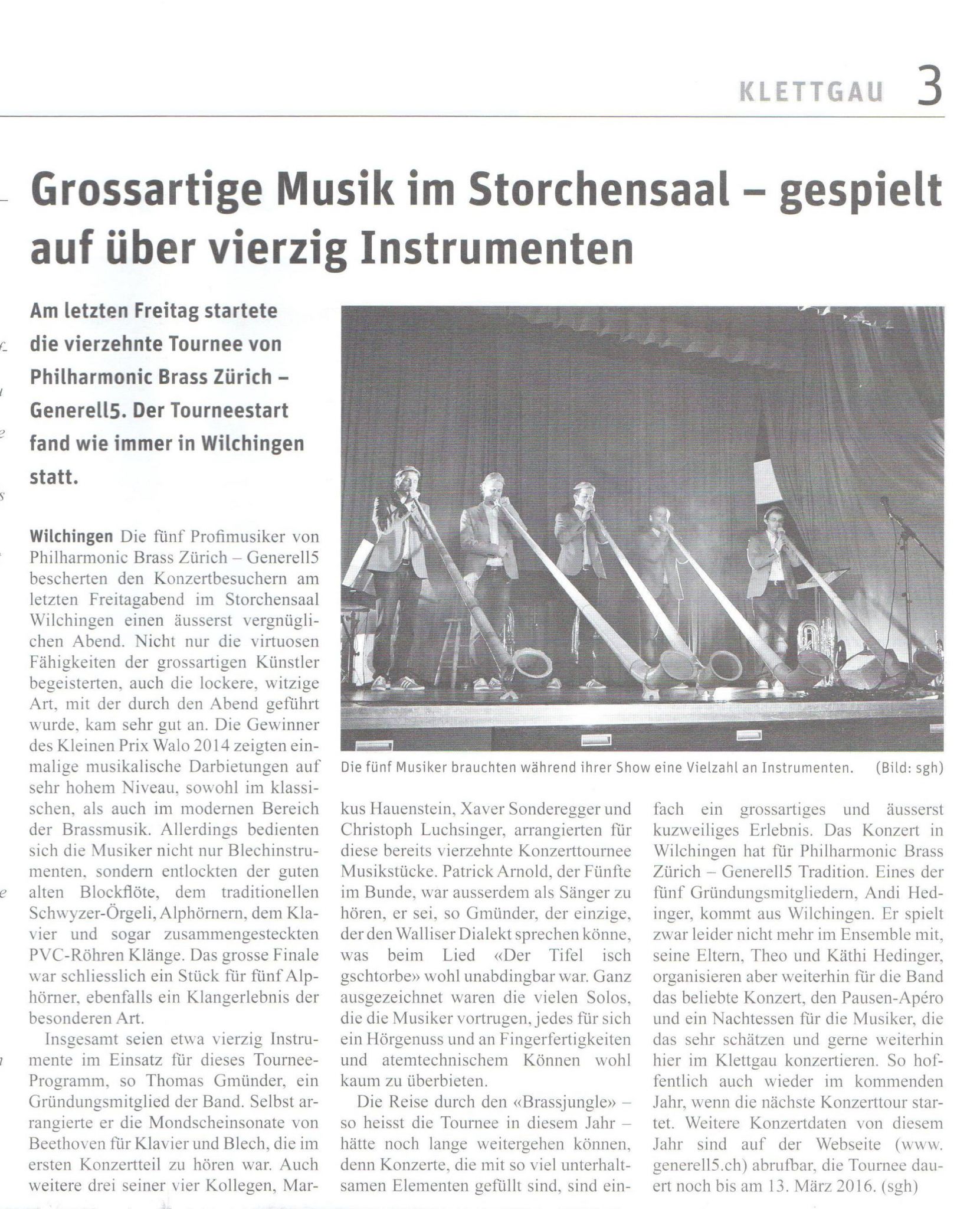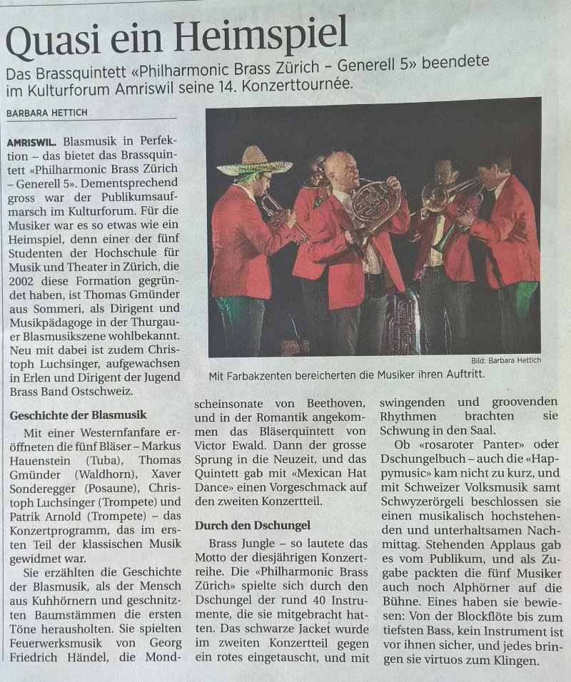 Zwischen Januar und März 2016 präsentierten wir unsere 14. Tour. Mit einem Jungle von über 40 Instrumenten ging es auf und ab durch die deutsche Schweiz. Nach dem Urschrei und einer Reise durch die Zeit waren sogar Pink Panther und Balu vor Ort. Mit Schweizer Volksmusik und einem musikalischen Höhepunkt mit 5 Alphörnern ging dann am 13. März 2016 der Vorhang von „Brass Jungle“ zum letzten Mal zu.