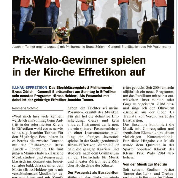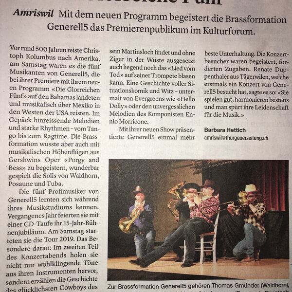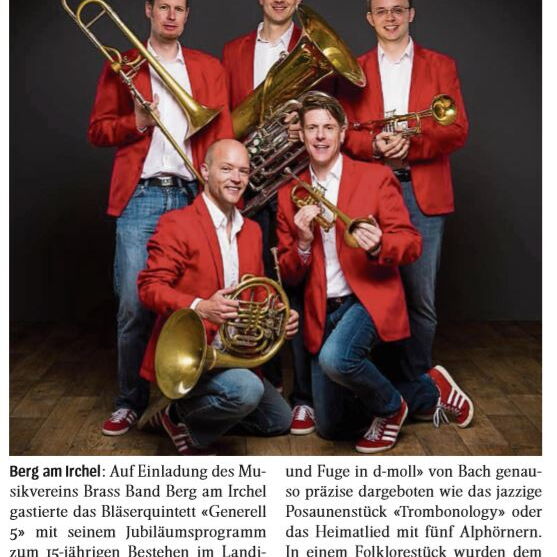 Thurgaukultur (März 2022) Mehr erfahren„Die Musikalität, Offenheit und Professionalität von Generell5 bleibt mir nach unserer Zusammenarbeit für die Samstagabendsendung Viva Volksmusik in bester Erinnerung. Generell5 haben bewiesen, dass die Kombination von Blechbläserquintett, Hackbrett und Blues wunderbar harmoniert und ich bin gespannt auf die nächsten Ideen und Projekte dieser tollen Formation“.